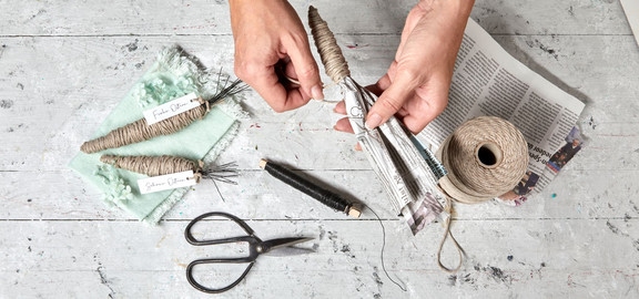 1 / Die Kordel an den Dekoringen knoten, mehrere Male umwickeln und das Kordelende mit einem Knoten fixieren.
