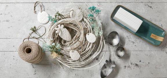 3 / Die Anhänger nun nach Packungsanleitung im Backofen aushärten und nach dem Auskühlen eine Kordel durch das Loch ziehen.