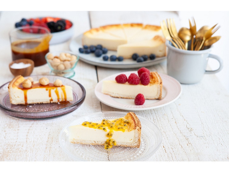 In der Hauptrolle: Unser Käsekuchen, der tiefgefroren auf seinen großen Auftritt wartet. Vorgeschnitten eingefroren lässt er sich je nach Anzahl der Gäste stückweise auftauen und portionieren. Varianten des beliebten Klassikers gibt es weltweit – mit verschiedenen Toppings kann sich jeder Gast ganz individuelle Kombinationen erstellen ohne, dass ein komplett neuer Kuchen gebacken werden muss. Für Puristen ist die Aufgabe einfach, denn der Käsekuchen schmeckt auch ohne Toppings nach mehr. Toppingliebhaber werden die Auswahl lieben und sich bestimmt auch ein paar Beeren mehr als Reserve auf dem Teller bunkern. Während der Kuchen auftaut wird das Toppingbuffet vorbereitet. Wir stellen hier unsere drei Favoriten vor: