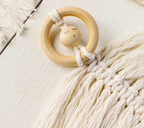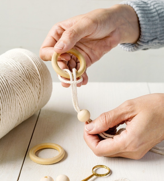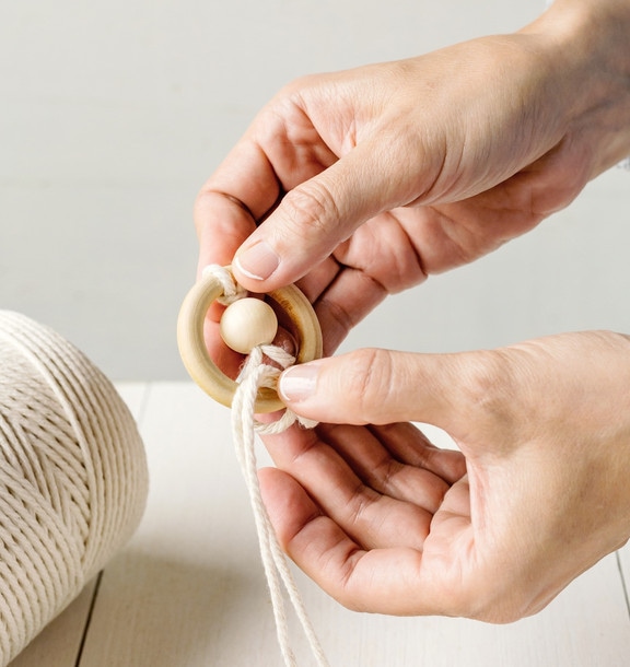 Nehmen Sie sich einen Holzring zur Hand und legen Sie die Schlaufe einmal durch den Ring, nun ziehen Sie die zwei Bänder, die über dem Ring liegen, durch die Schlaufe, welche unter dem Ring liegt durch. Zudem fädeln Sie eine Holzperle auf die zwei Garnfäden auf und ziehen alles schön fest. Drehen Sie den Holzring mit der daran befestigten Perle samt Garn nach oben und legen Sie das Garn auf die gegenüberliegende Hinterseite des Rings. Danach legen Sie das Garn nach vorne über den Ring und ziehen es durch den Ring zwischen den beiden Garnfäden auf der Hinterseite durch.