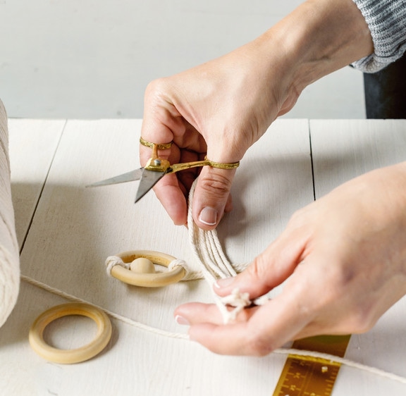 Im folgenden Schritt nehmen Sie sich ein Lineal zur Hand und schneiden mit der Schere von dem Makramee-Garn 30 Fäden à 20cm zurecht.