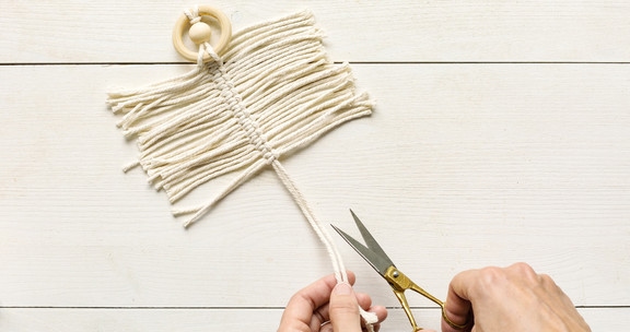 Sobald Sie die kurzen Garnstränge vollständig zu dünnen Fäden ausgekämmt haben, nehmen Sie sich die Schere zur Hand und schneiden Sie sich ihr Makramee in die gewünschte Form zurecht.