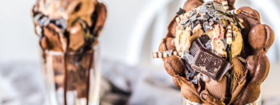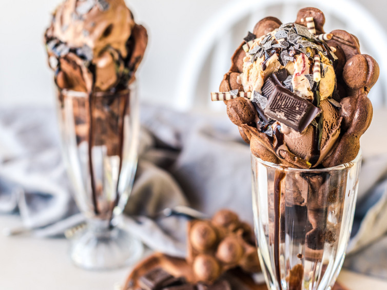 Für die nächste Bubble Waffle kommt einfach noch ein wenig Kakaopulver in den Grundteig. Nach dem Backen und Abkühlen wird die Waffel mit unserem Eiscremeklassiker Schoko (Art.-Nr. 1066) gefüllt. Um die volle Dröhnung Schokolade zu genießen, wird diese Kreation noch mit Zartbitterschokolade und unserer eismann Schokosoße (Art.-Nr. 2674) abgerundet. Die Erwachsenen-Variante erlaubt übrigens auch einen Schuss eismann Cappuccino Likör (Art.-Nr. 34239) eine unwiderstehliche Kombination wie wir finden.