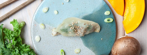 Wir erwärmen das Öl in einer Pfanne und erhitzen die Champignons, Kürbiswürfel und den Grünkohl zusammen mit dem Ingwer und Knoblauch. Dann geben wir die Frühlingszwiebeln und die Gewürze dazu und vermischen alle Zutaten miteinander. Jetzt können wir die Füllung wie oben beschrieben in die Dumplingblätter geben und falten.