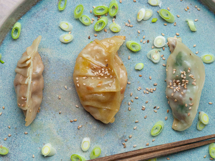 Wir mögen Dumplings am liebsten, wenn der Boden knusprig ist und der Rest einen angenehmen Biss hat. Dafür legen wir die Dumplings mit der flachsten Seite im Abstand von gut einem Zentimeter in eine Pfanne mit heißem Öl und braten sie für 2 Minuten an, bis sie goldbraun sind. Dann nehmen wir uns entweder einen Pfannendeckel oder ein Backblech und halten es vor die Pfanne, während wir 120ml Wasser da zugießen. Die Pfanne verschließen wir sofort mit dem Deckel, damit der Dampf nicht entweicht und die Dumplingblätter weich werden. Auf mittlerer Hitze garen wir die Dumplings für 5 Minuten und öffnen dann den Deckel, um den Dampf entweichen zu lassen. Für eine Minute werden die Dumplings noch ohne Deckel gebraten, dann können wir sie mit einem Pfannenwender herausholen und sofort mit Sojasauce servieren. Guten Appetit!