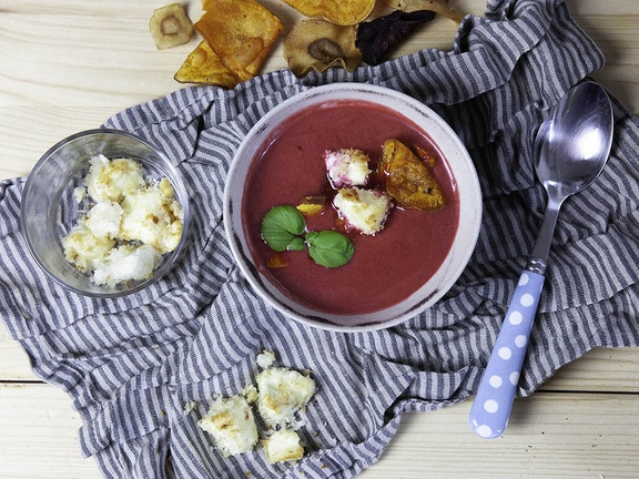 Rote Beete-Suppe mit Knusperfeta und Gemüsechips