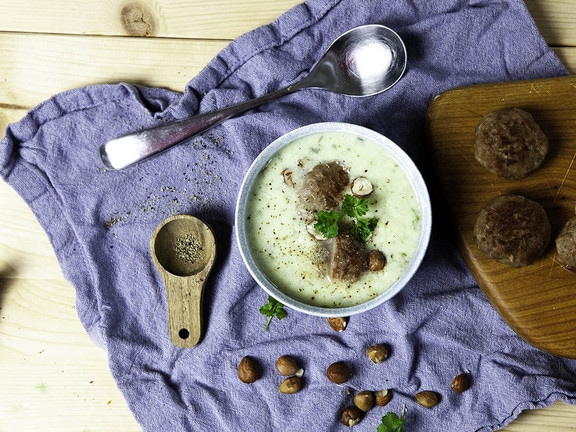 Kohlrabi-Kartoffel-Cremesuppe mit Minifrikadellen und Haselnuss