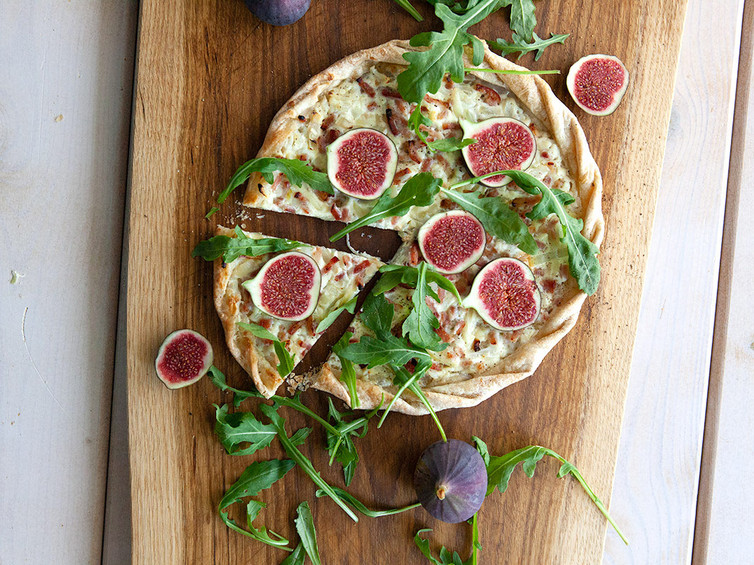Flammkuchen Elsässer Art mit Feigen und Rucola (oben)