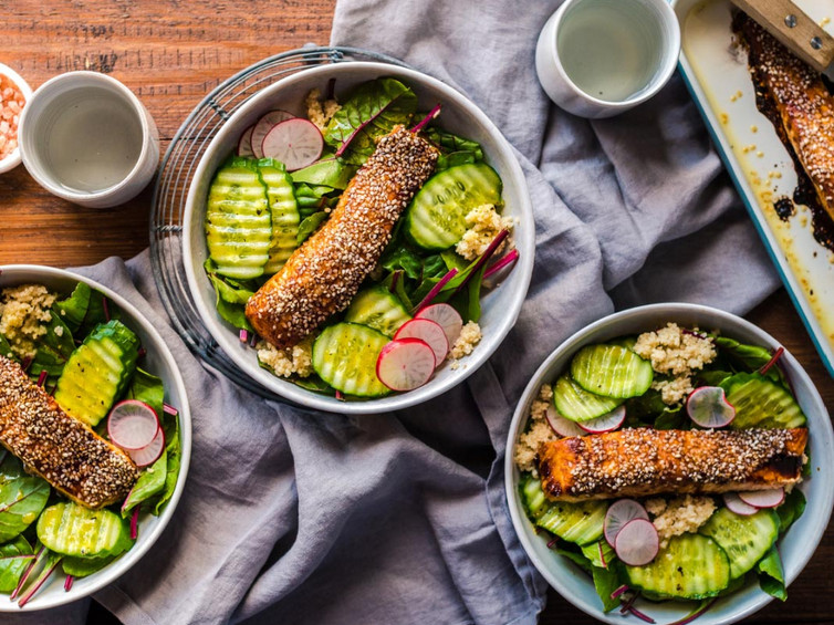 So langsam kündigt sich der Frühling an und man hat endlich wieder Lust auf Salate und andere leichte Kost. Wie wäre es beispielsweise mit einem Mangoldsalat mit Radieschen, Gurke, Couscous und feinem eismann Bio Lachsfilet? Für den besonderen Schliff marinieren wir unseren Lach zusätzlich mit Sojasauce, Honig und etwas Zitronensaft und geben ihn anschließend für ca. 15 Minuten in den Backofen. So wird er besonders saftig und lecker.