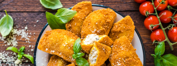 Zu guter letzt servieren wir an unserem italienischen Abend ein echtes Highlight, denn unter der knusprigen Kruste aus Ei, Paniermehl und Parmesan verstecken sich unsere eismann Pilz-Trüffel-Panzerotti (Art.-Nr. 17499). Diese haben wir kurzerhand für das ultimative Geschmackserlebnis frittiert.