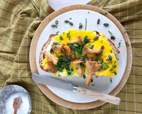 - Wir schneiden das Brot in Scheiben, richten das Pilzomelett darauf an und streuen Schnittlauch und Kürbiskerne darüber.