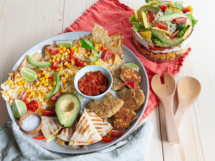 Der gute alte Schichtsalat bekommt ein mexikanisches Upgrade. In einer großen Schüssel wird Schicht für Schicht gute Laune aus Eisbergsalat, Hackfleisch, Kidneybohnen und Mais gestapelt. Die Soße bilden Salsa und Creme-Fraiche, mexikanisches Flair bringen als Krönung Nachos, Avocados und geriebener Käse mit.
