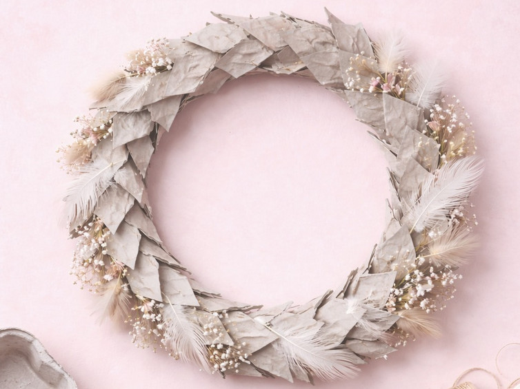 Nach Belieben kleine Trockenblumen, Federn oder Osterdeko zwischen die Blätter kleben.