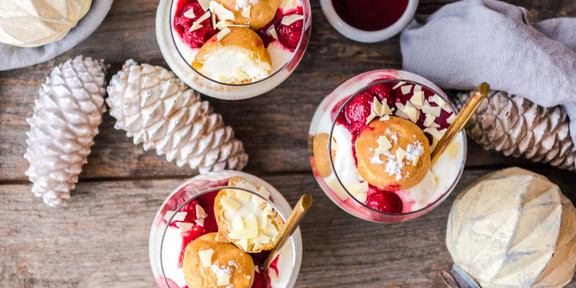 Für den krönenden Abschluss servieren wir ein Dessert im Glas. Hierfür kommen unsere feinsten eismann Windbeutel mit Himbeeren und weißer Schokolade zusammen. Die Himbeeren werden einfach mit etwas Puderzucker und Zitrone erhitzt und danach durch ein Sieb passiert. Noch etwas geriebene weiße Schokolade und schon steht auch das Dessert für unser eismann Express-Menü.