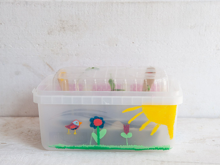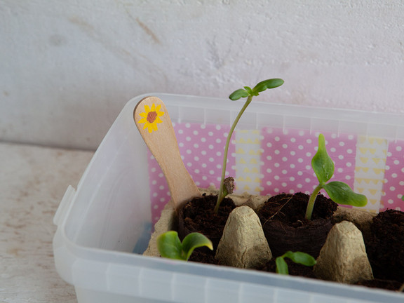 Auf die Eisstiele oder Pappstreifen schreiben wir die Sorte unserer Samen oder malen ein passendes Bild. Die Eisstiele sind auch gleichzeitig die Halterung für die Gemüseverpackung, damit die Jungpflänzchen nicht erdrückt werden und am Anfang trotzdem schön warm und geschützt aufwachsen können. Sobald die ersten grünen Blätter gewachsen sind, mögen die Pflänzchen es hell und kühl.