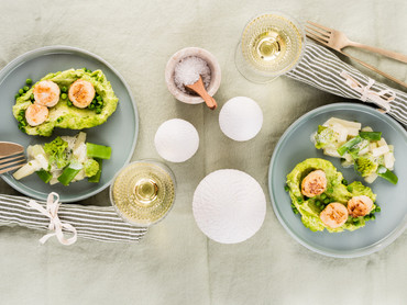 Festtagsschmaus: Jakobsmuscheln mit Erbsenpüree, feinem Buttergemüse und Crémantschaum