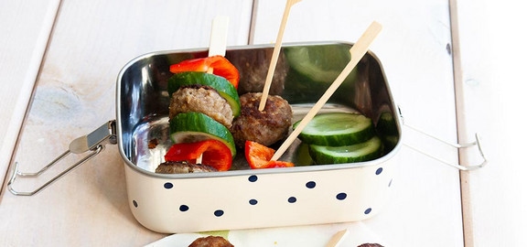 - Stecke die Frikadellen und das Gemüse abwechselnd auf Spieße – und schon hast Du einen herzhaften Snack, der schnell zubereitet ist und sich problemlos transportieren lässt.