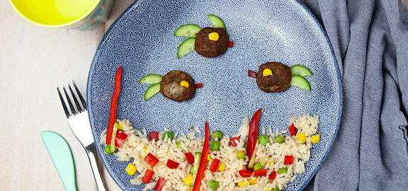 Vegetarische Frikadellenfische mit Gemüsereis: Für kleine Unterwasserfans