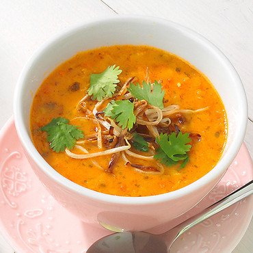Rote Linsen Kokossuppe mit Sesam Sprossen