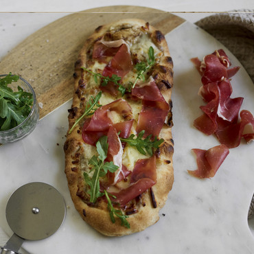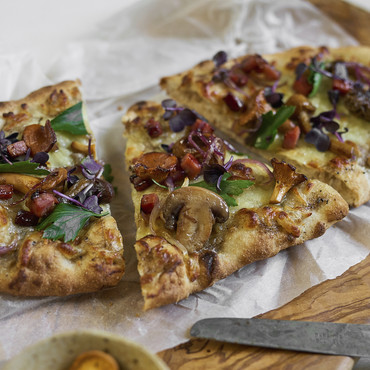 Im Holzofen auf Stein gebackene, längliche Pizza belegt mit Mozzarella und Sauce (22%), fein abgeschmeckt mit Sommertrüffel, auf einem mit Dinkelvollkornmehl verfeinerten Boden. Tiefgefroren.