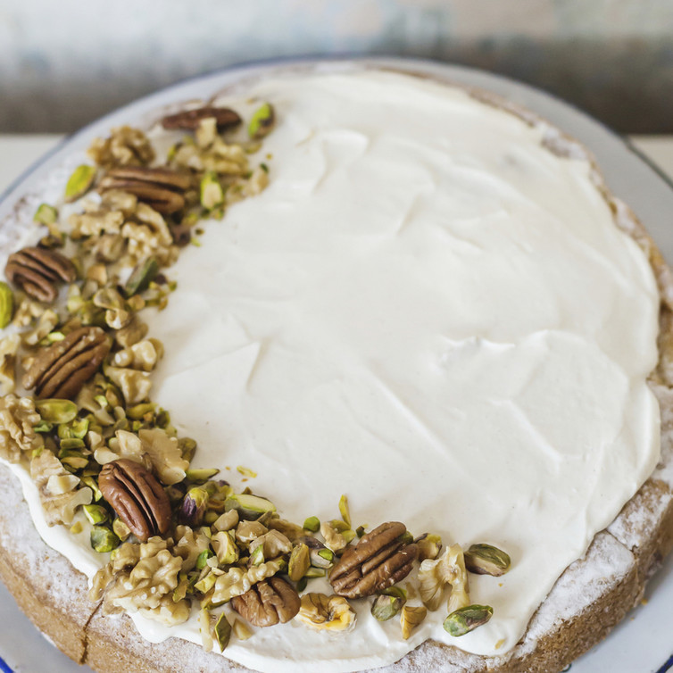 Die Nüsse und Pistazien grob hacken und den Kuchen damit bestreuen.