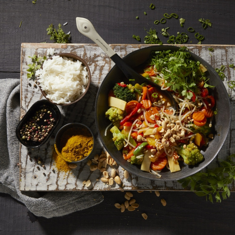 Asia-Gemüse auf Tellern anrichten, mit Erdnüssen bestreuen und nach Wunsch mit Kroepok oder Duftreis servieren.