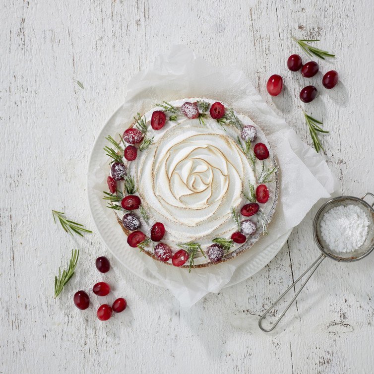 Auf die etwas abgekühlte Tarte mit Rosmarinspitzen und halbierten Cranberrys einen lockeren Kranz dekorieren und mit Puderzucker bestreut servieren.