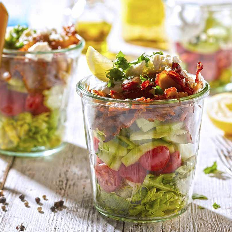 Die Salatzutaten abwechselnd in ein Glas oder eine Bentobox schichten. Das Joghurtdressing darüber träufeln lassen. Das gebratene Hähnchenfleisch auf den Salat setzen und den Feta-Käse darüber zerbröseln.