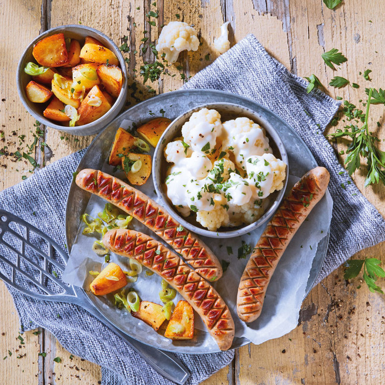 Béchamel Blumenkohl mit Bratwurst