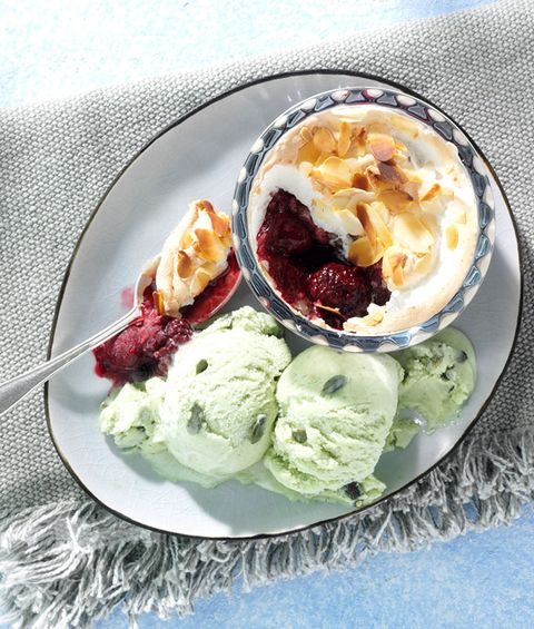 Eiweiß mit übrigem Zucker, Salz und Zitronensaft sehr steif schlagen, auf dem Dessert verteilen, mit Mandelblättchen bestreuen und im vorgeheizten Backofen bei 250 °C Ober-/Unterhitze (230 °C Umluft) ca. 3 - 5 Minuten goldbraun überbacken.