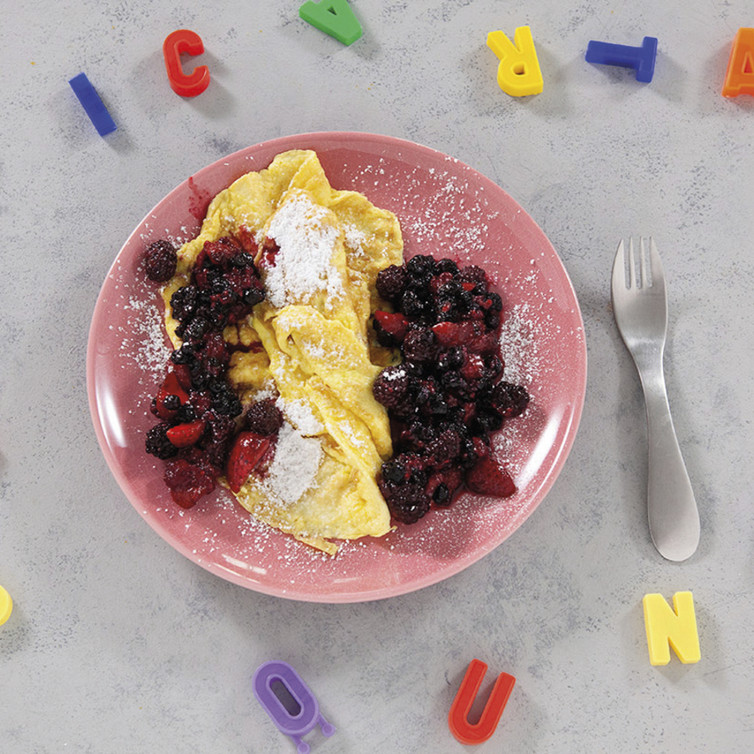 Auf einem Teller das Omelett mit den Früchten anrichten und dick mit Puderzucker bestreut servieren.