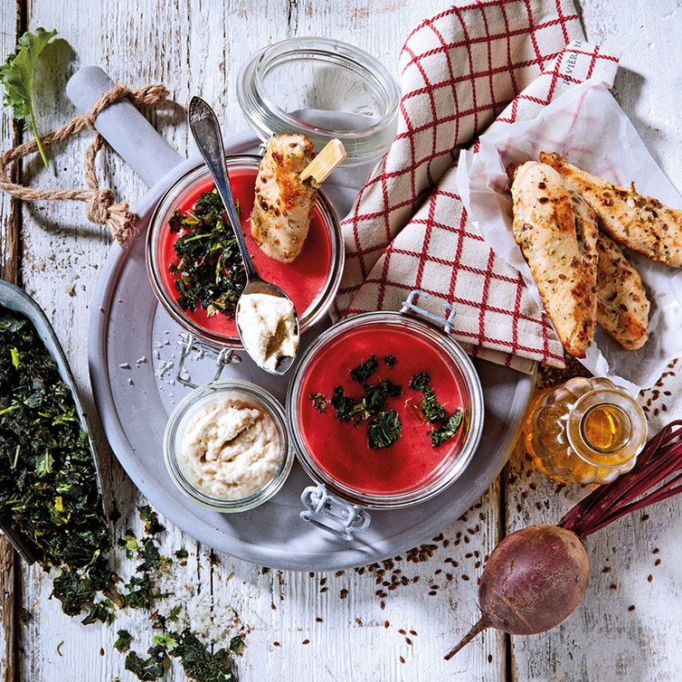 Die Suppe im Weck-Glas oder auf einem Teller anrichten und jeweils mit einem Klecks Meerrettich, Grünkohl-Chips und einem Hähnchenfilet dekoriert servieren.