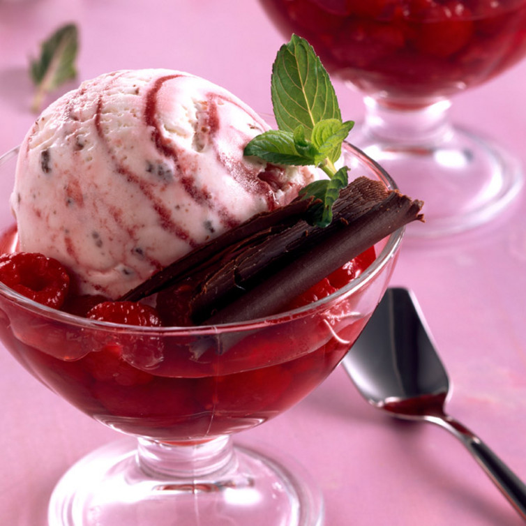 Cremiges Johannisbeer- und Vanilleis mit einem Schuss Himbeergeist, serviert mit frischen Himbeeren.