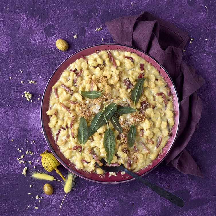 BIO Eierknöpfle-Auflauf mit Gorgonzola, Südtiroler Speck & knusprigem Salbei