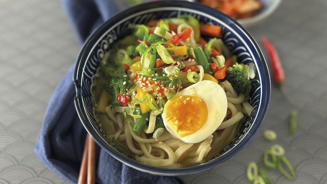 Die gegarten Ramennudeln in Schalen verteilen und jeweils mit einer halben Eihälfte belegen. Die heiße Brühe mit dem Gemüse darüber gießen.