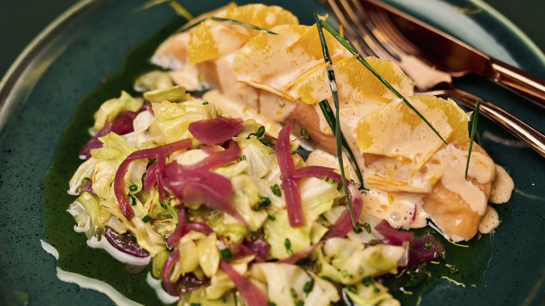 Den sautierten Spitzkohl mittig auf den Tellern anrichten. Den zart gegarten Lachs darauf oder daneben setzen und mit der aufgeschäumten Orangen-Weißwein-Sauce umgießen. Mit Orangenfilets, feinen Orangenzesten und etwas Schnittlauch garnieren.