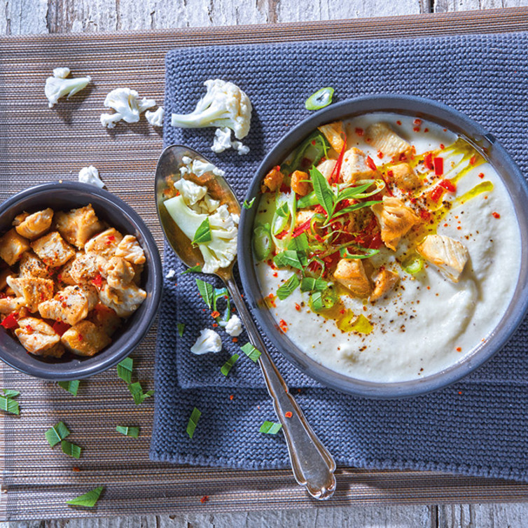 Wenn Du nach einer einfachen, aber raffinierten Suppenidee suchst, bist Du hier genau richtig: Unsere Blumenkohlcremesuppe mit Hähnchen-Chili ist in nur 45 Minuten zubereitet und ein echtes Geschmackserlebnis, das außerdem leicht umzusetzen ist. Alles, was Du brauchst, sind ein Suppentopf, ein wenig Zeit und Lust auf eine wärmende Köstlichkeit, die durch ihre Zubereitungsart schön cremig und gleichzeitig wunderbar aromatisch ist.