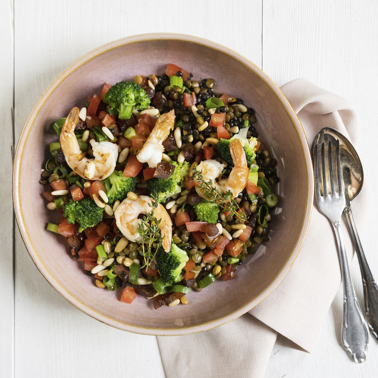 Brokkoli-Linsen-Salat mit frischen Tomaten und Easy Peel Garnelen (von Johann Lafer)