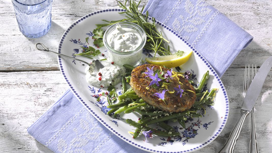 Die Bohnen wie ein Holzstapel mit den Medaillons und dem Dipp auf dem Teller nett anrichten.