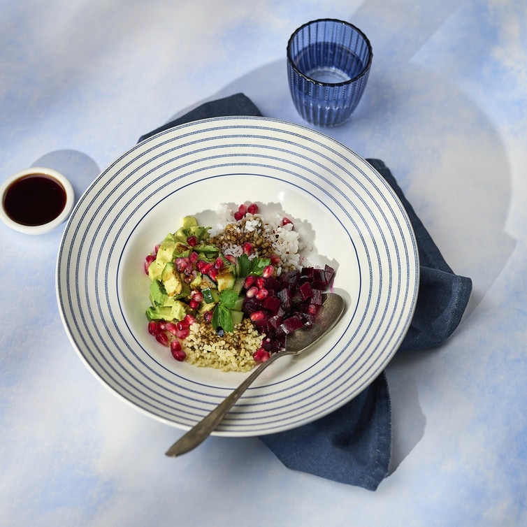 Reis und Bulgur jeweils nach Packungsanweisung garen und anschließend abkühlen lassen. Rote Bete würfeln, Avocados halbieren, entkernen und in Stücke schneiden. Gurken längs halbieren und in dünne Scheiben schneiden, anschließend die Granatapfelkerne herauslösen. Alle Zutaten nebeneinander oder gemischt in einer großen Schüssel anrichten, mit Zitronensaft und Olivenöl beträufeln und mit Salz und Pfeffer abschmecken. Zum Schluss mit frischen Kräutern garnieren und die Bowl großzügig mit der Crema Granatapfel veredeln. Nach Belieben kann die Bowl zusätzlich mit etwas Feta oder einem Klecks Joghurt abgerundet werden.