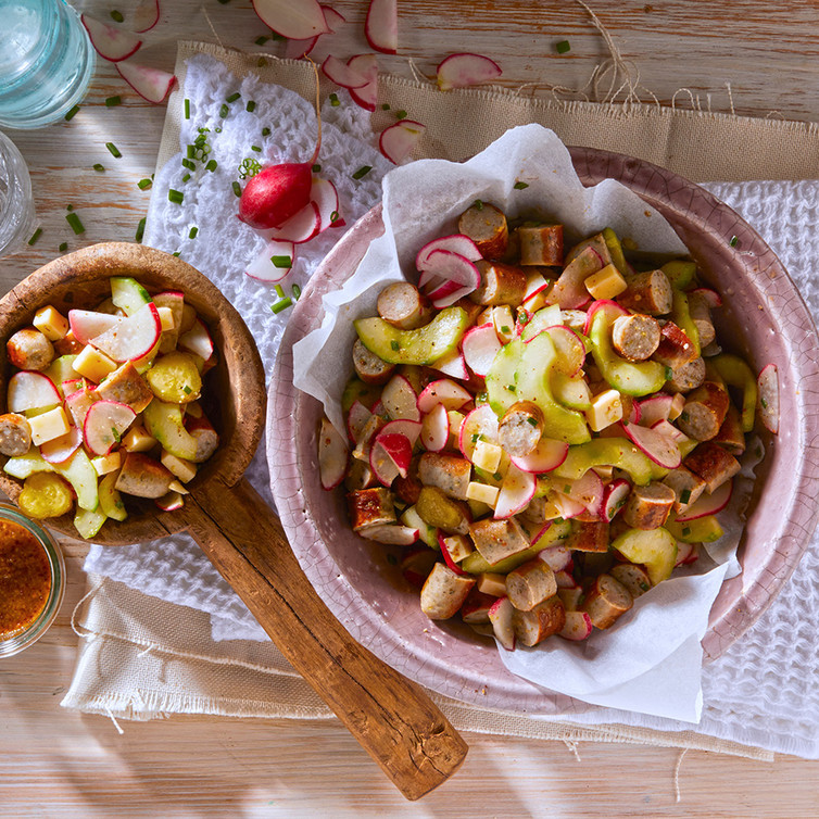 Bunter Bratwurstsalat mit Radieschen, Gurke und Käse