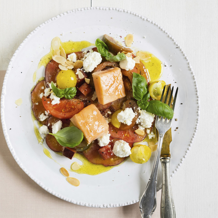 Tomaten auf einem Teller oder einer großen Platte anrichten. Zerbröckelten Fetakäse und geröstete Mandelblättchen gleichmäßig darüber verteilen. Grob gehacktes Basilikum darüber streuen und mit dem abgekühlten Dressing gleichmäßig beträufeln. Zum Abschluss mit einer Prise Meersalz und frisch gemahlenem Pfeffer würzen und mit den confierten Lachswürfeln garnieren.