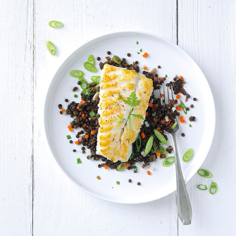 Auf einem Teller mittig eine Portion Linsensalat geben und den Fisch on top. Mit der Buttersauce beträufeln und mit den restlichen Frühlingszwiebelringen bestreuen.