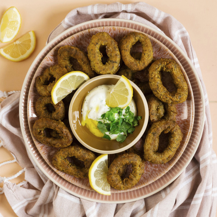Die Calamares Mediterran nach der Zubereitungsempfehlung in der Fritteuse oder im Backofen knusprig zubereiten.