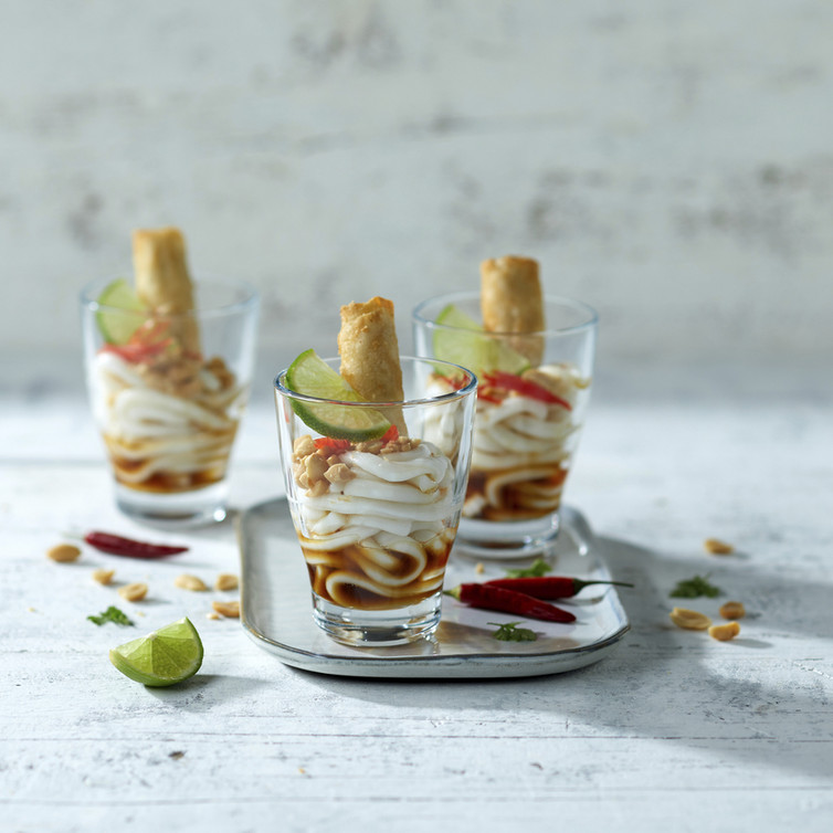 Gläser mit Udon-Nudeln befüllen, jeweils einen Kleks der scharfen Sauce auf jedes Glas setzen, mit gerösteten Erdnüssen und Chilistreifen bestreuen und anschließend mit Chinaröllchen toppen.