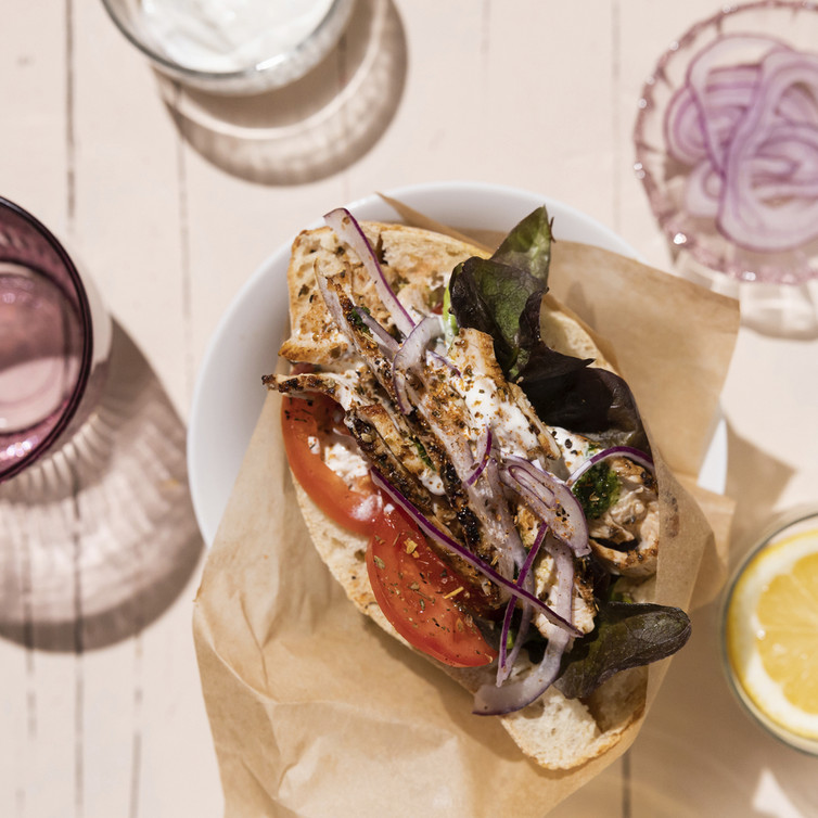 Mit einem Löffel etwas Joghurtsauce in die Brottaschen streichen. Etwas Eisbergsalat und vorbereitetes Gemüse ins Brot geben, Hähnchenfleisch darüber verteilen und mit Joghurtsauce und Zwiebelringen dekorieren.