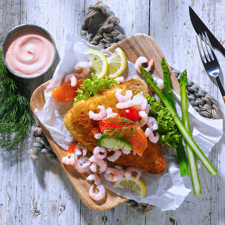 Den Vollkorntoast goldbraun toasten. Jede Scheibe mit Lollo Biando, einem Schollenfilet, Tiefseegarnelen, Scheiben vom Räucherlachs, Kaviar, Tomatenscheiben und Gurke belegen. Mit Zitronenscheibe und Dill dekorieren. Das selber gemachte French Dressing separat dazu servieren.
