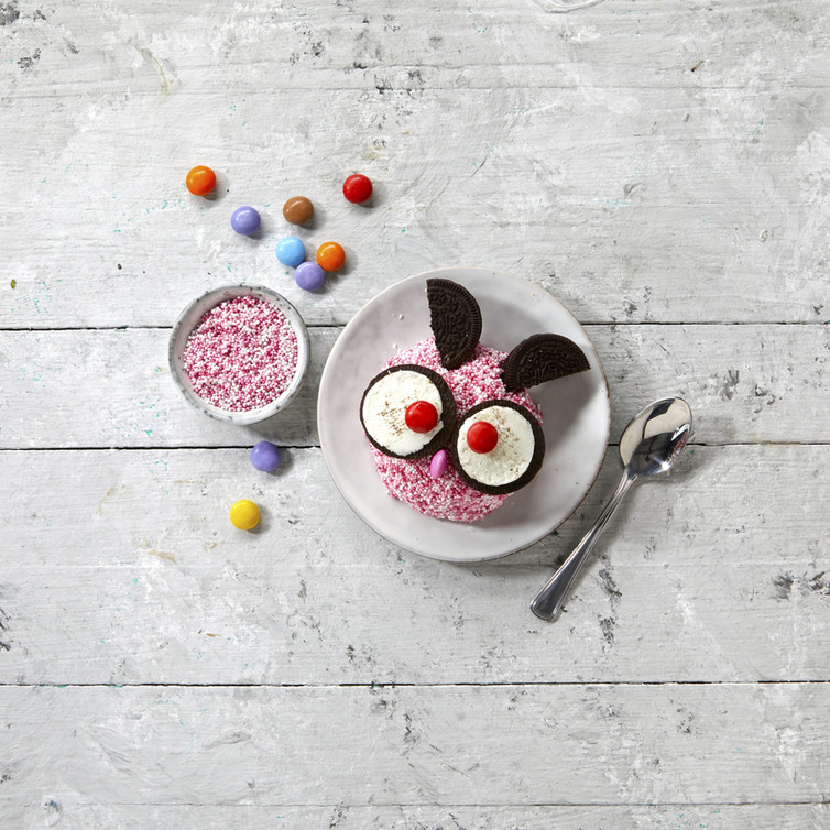 Für die Ohren jeweils einen Oreo Keks halb durchschneiden. Für die Nase wird jeweils eine halbe Schokolinse bereitgestellt.