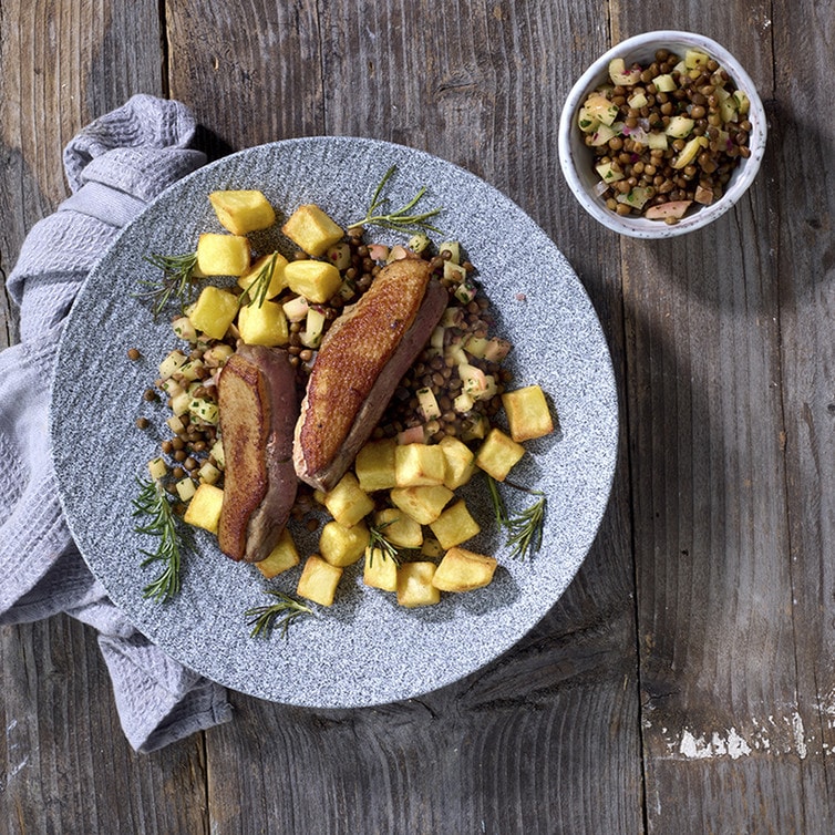 Entenbruststreifen auf Pommes Sautées & warmem Apfel-Linsensalat