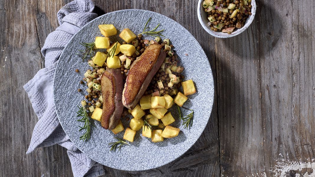 Anrichten: Die Pomme Sautées auf den Tellern verteilen. Den warmen Apfel-Linsensalat daneben anrichten. Die Entenbruststreifen darauf oder daneben drapieren. Nach Belieben mit etwas Petersilie oder einem Spritzer Zitronensaft abrunden.